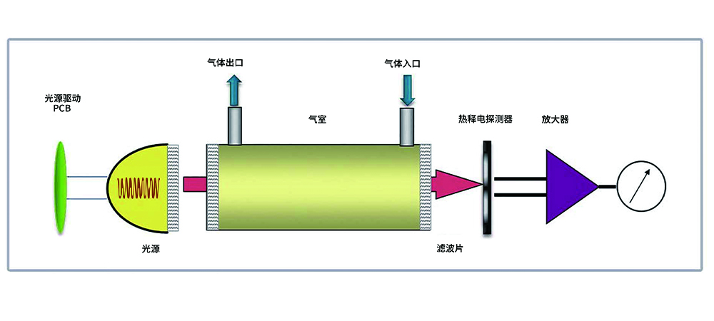 该模块使用的非分光红外(NDIR)技术是基于非对称多原子分子气体(如CO2、NO等)对特定波长的红外光具有选择性吸收的性质实现对气体浓度的检测。当红外光通过待测气体时,这些气体分子对特定波长的红外光有吸收,光的强度的降低与分子的数量成比例,光强度的变化和分子数量的关系服从朗博-比尔(Lambert-Beer)吸收定律,气体的浓度就可以确定。